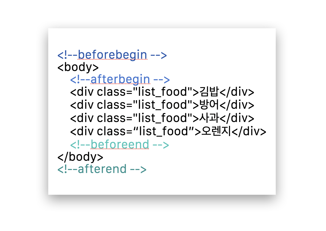 position의 값은 beforebegin, afterbegin, beforeend, afterend만 사용할 수 있다.