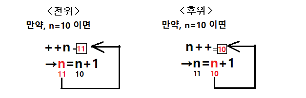 반대로 연산자 ++가 피연산자 n보다 뒤에 위치할 때를 후위라 하고 1증가하기 전 값이 연산결과값이다.