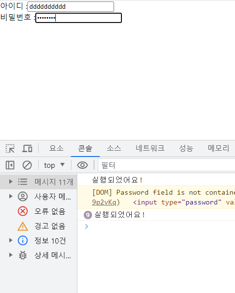 text 타입의 input과 password 타입 input 태그 하나씩 만들었다.