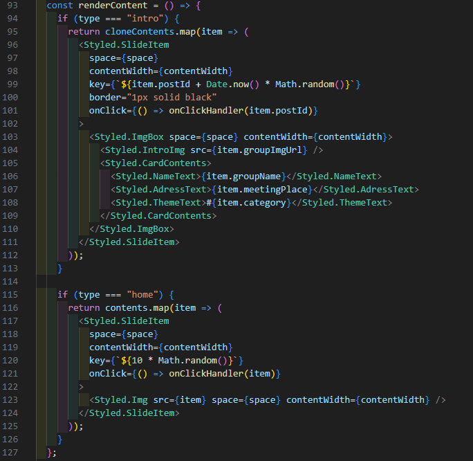 슬라이더 전체 길이와 버튼 클릭 시 이동할 길이 등이 모두 받아온 props 기준으로 구성되어 있어서 슬라이더 컴포넌트 안에서 아이템 구조가 작성 되어야 했다.